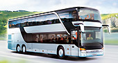 Doppelstockbus 70 89 Sitzplätze z.B. der Setra S 431 DT, 12 bis 14 Meter Länge, Schlafsessel auf zwei Ebenen und dadurch für sehr große Gruppen mit hohen Komfortansprüchen im Fernverkehr geeignet. Gibt es in verschiedenen Klassifizierungen, je nach Sitzabstand und Ausstattungsmerkmalen.